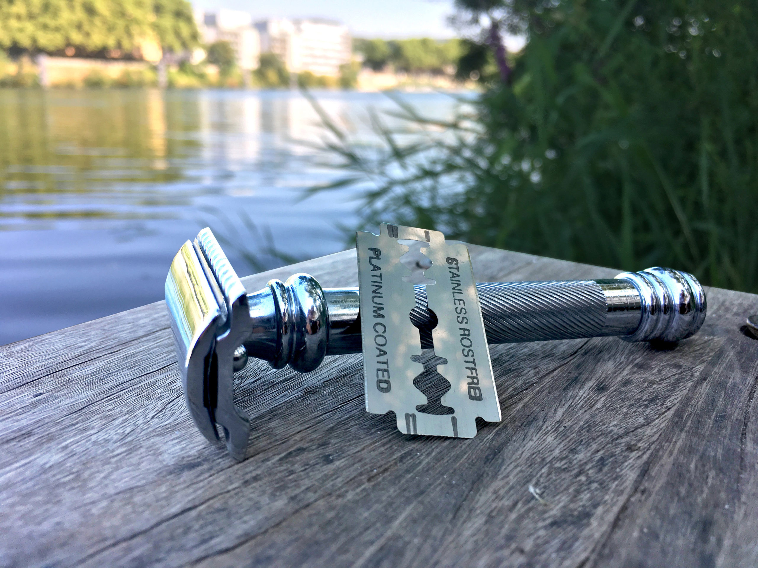 Grace à un axe situé dans le manche, il est possible de dévisser la tête protectrice du rasoir afin de placer une lame. Il suffit ensuite de remettre la tête et de visser pour serrer le tout. Rapide, pratique, ça en est presque enfantin (évidemment on ne laissera pas les enfants jouer avec, il ne faut rien exagérer).